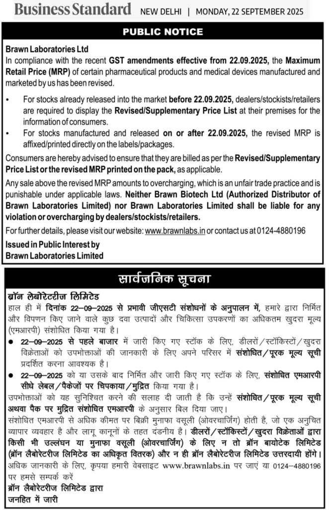 Any sale above the revised MRP amounts to overcharging, which is an unfair trade practice and is punishable under applicable laws. Neither Brawn Biotech Limited (authorized distributor of Brawn Laboratories Limited) nor Brawn Laboratories Limited shall be liable for any violation or overcharging by dealers/stockists/retailers.
